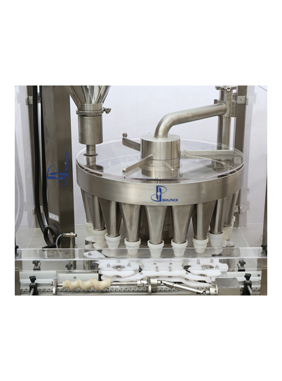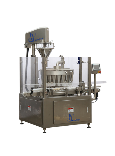 旋轉式充填機具有很高的生產效率和生產速度,即使在非??量痰纳a要求下,旋轉式充填系統將物料連續的分發到旋轉的多工位漏斗里,瓶子在漏斗下,一個瓶子對應一個漏斗,不等距螺旋和星形轉盤將瓶子均勻的對應到每一個漏斗下同步旋轉并振動,螺桿計量機精確的將物料充填到漏斗里,然后物料在星形轉盤旋轉四分之三圈的時間內從漏斗落到瓶子里,特別適用于瓶子口徑小,但包裝速度要求高的各種粉末和小顆粒物料。