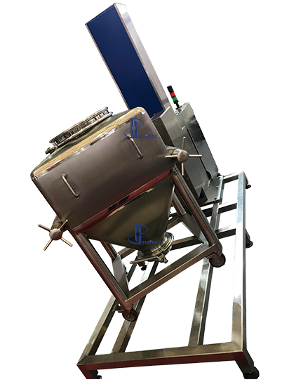 2,回轉體(混合料斗)與回轉軸線成30°夾角,混合料斗中的物料隨回轉體翻動外,同時沿斗壁做切向運動,產生 強烈的翻轉和高速的切向運動,從而達到混合效果。