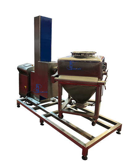該機由立柱、機座、回轉叉架、驅動、制動、控制系統等部件組成。將混合料斗推入回轉叉架并鎖緊螺母,啟動控制系統,將料斗提升到混合高度并可靠定位。驅動系統按設定的時間、轉速等數據進行自動混合?;旌献鳂I結束,回轉叉架垂直停止,料斗自動下降到地面,整機停止,并打印工藝數據。松開回轉叉架的緊鎖螺母,將料斗推出到下一個工序。