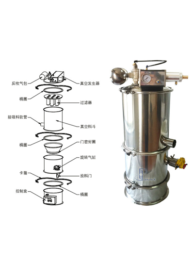 氣動式真空上料機是利用壓縮空氣通過真空發生器產生高真空實現對物料的輸送,不需要機械式真空泵,具有結構簡單、體積小、免維修、噪音低、控制方便、消除物料靜電和符合GMP要求等優點